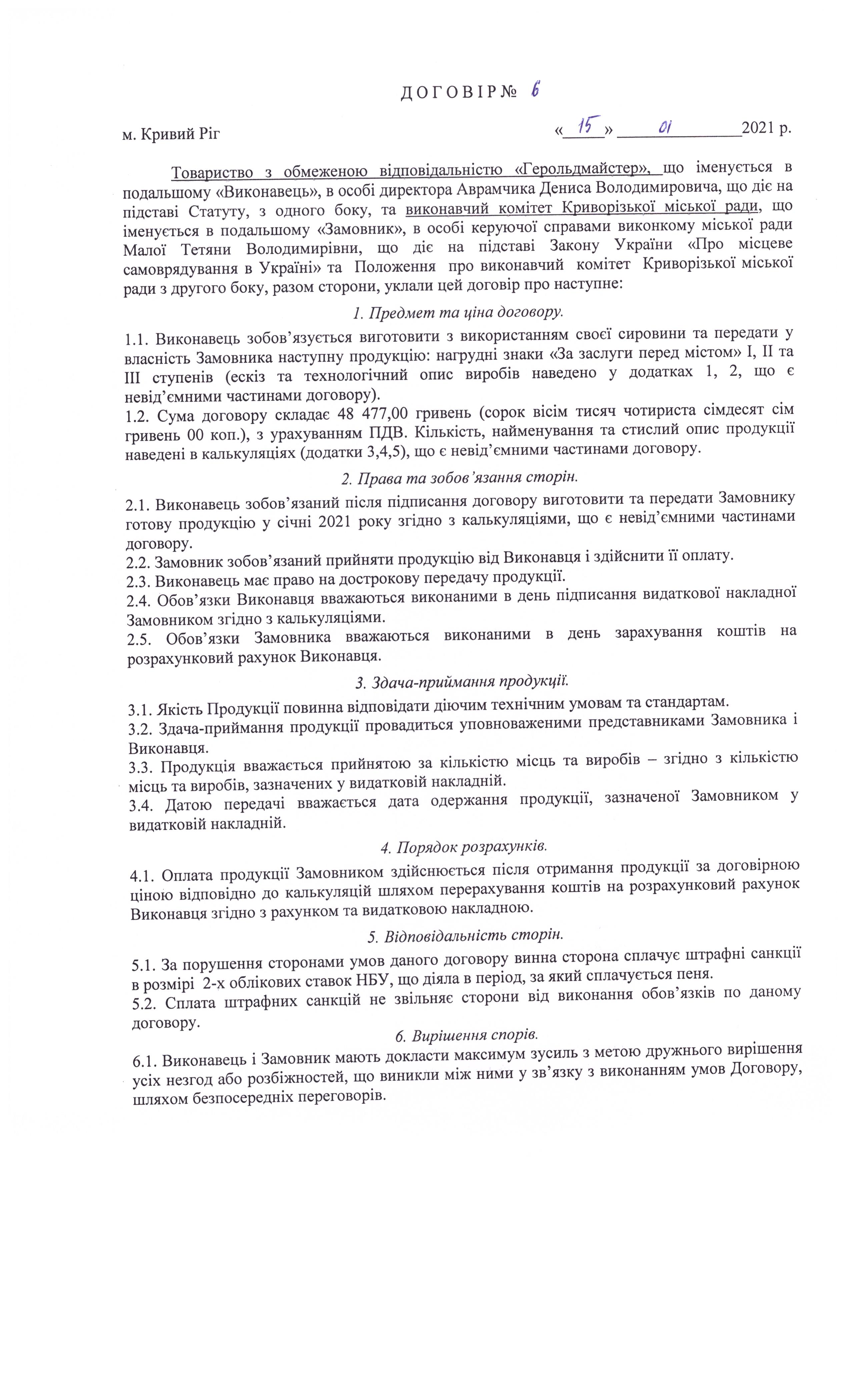 Договір на виготовлення нагрудних знаків №6 від 15.01.2021